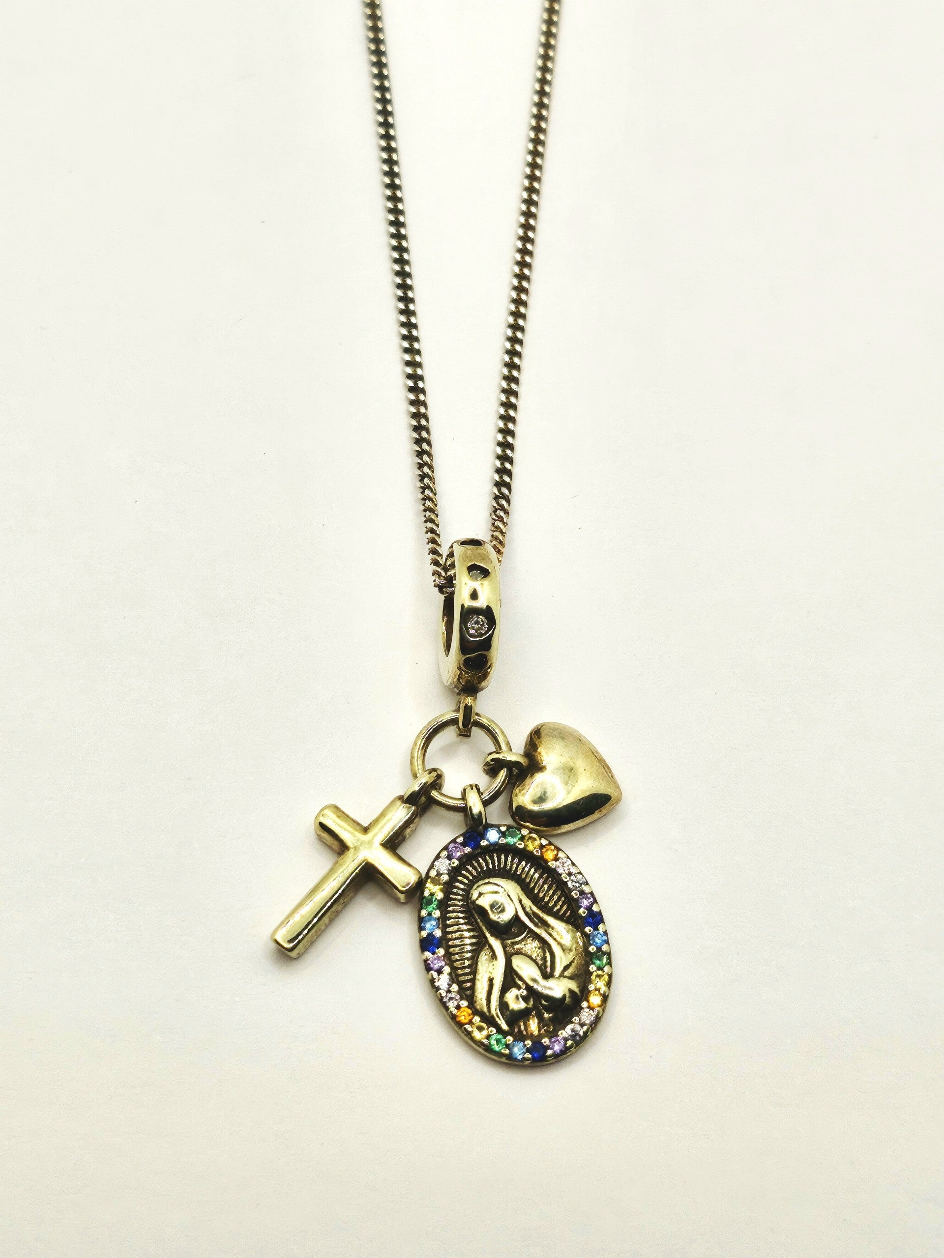 (Mary/heart/cross) with Cubic Zirconia on a gold plated sterling silver 20" curb chain.